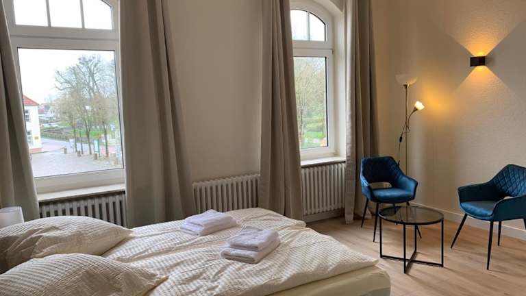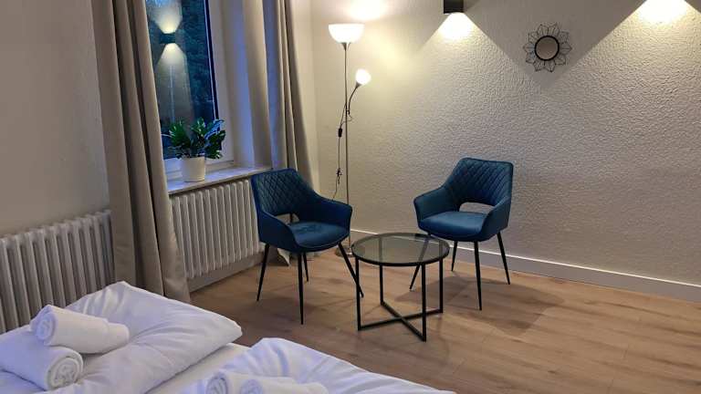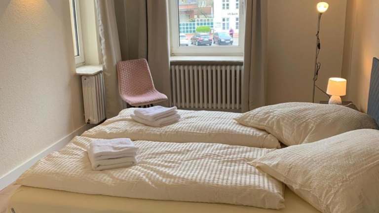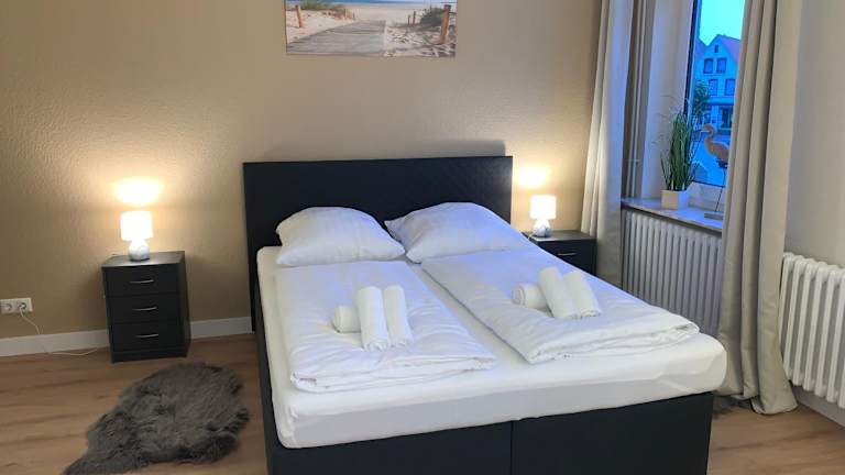 Die Ferienwohnung besteht aus 3 Schlafzimmern, einem Wohnzimmer sowie einer voll ausgestatteten Küche mit Kühlschrank und Kaffeemaschine. Zudem gibt es 2 Badezimmer mit Dusche. Handtücher und Bettwäsche werden bereitgestellt.