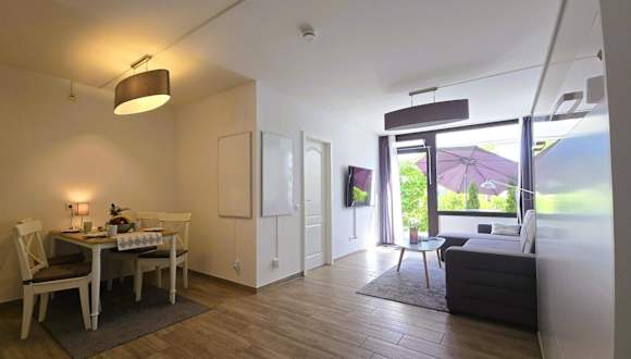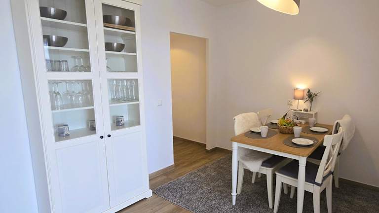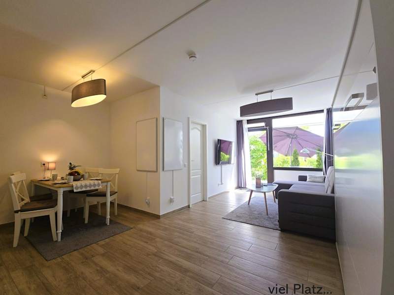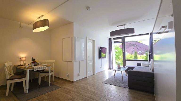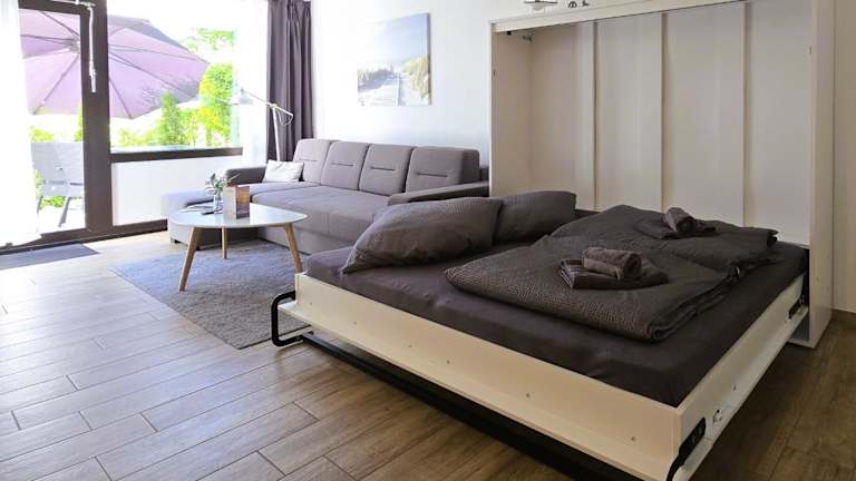 Die Ferienwohnung besteht aus einem Schlafzimmer, einem Wohnzimmer und einer voll ausgestatteten Küche mit Ofen und Kaffeemaschine. Zur Ausstattung gehört zudem ein Badezimmer mit Dusche und Haartrockner. Für zusätzlichen Komfort können Handtücher und Bettwäsche gegen Aufpreis bereitgestellt werden.