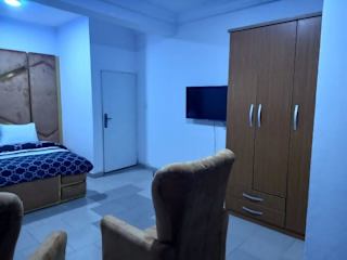 Die Unterkunft Mega Pavilion Apartment Gwarinpa bietet Übernachtungsmöglichkeiten auf einem modernen Niveau. Sie zeichnet sich durch eine Terrasse, einen kostenlosen Privatparkplatz, ein Restaurant und eine Bar aus. Zusätzlich steht ein Zimmerservice zur Verfügung und die Rezeption ist rund um die Uhr besetzt. Die Nichtraucher Unterkunft sorgt für ein angenehmes Ambiente.