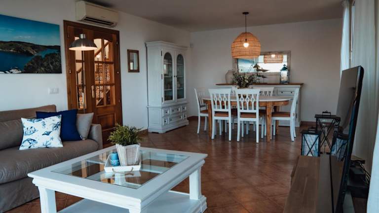 Menurka - Port d'Addaia bietet Übernachtungsmöglichkeiten in einem geschmackvoll eingerichteten Ferienhaus mit eigenem Pool. Die Unterkunft verfügt über einen Garten, eine Terrasse sowie einen ganzjährigen und saisonalen Aussenpool. Es sind keine Junggesellen- oder Junggesellinnenabschiede erlaubt, und Haustiere sind gestattet.