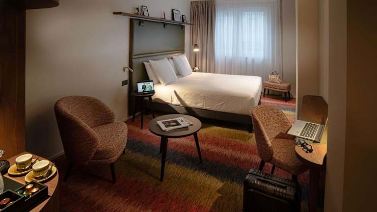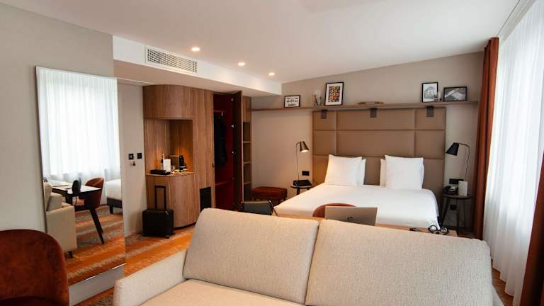Die Zimmer verfügen über ein angenehmes Raumklima, ein Kingsizebett und ein Sofabett. Zustellbetten sind auf Anfrage möglich. Jedes Zimmer ist mit einem Safe, einer Minibar, einem Minikühlschrank sowie einer Tee-/Kaffeemaschine ausgestattet. Zur technischen Ausstattung gehören ein TV-Gerät sowie kostenloses WiFi. Die Badezimmer sind mit einer Dusche und einer Badewanne ausgestattet, und ein Haartrockner ist ebenfalls vorhanden. Das Hotel bietet Familien- und Nichtraucherzimmer sowie auf Anfrage auch rollstuhlgerechte Zimmer.