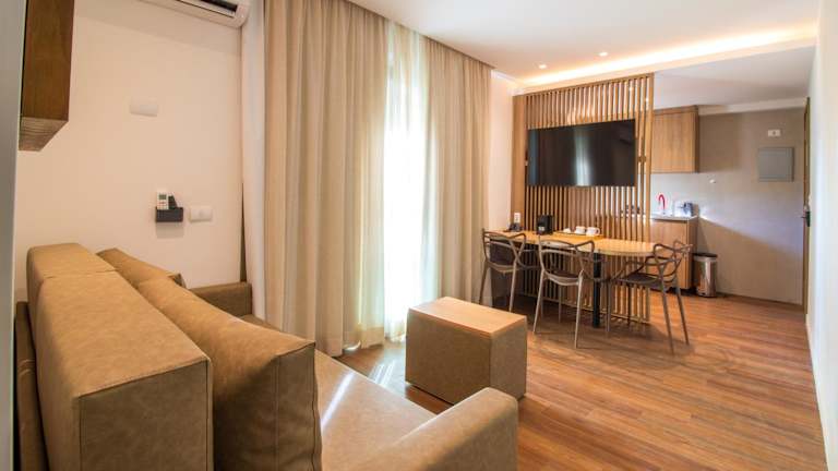 Die Unterkunft verfügt über 52 Zimmer und 27 Studios, die alle geräumig und komfortabel sind. Jedes Zimmer verfügt über einen Wohnbereich, eine Küche und ein Badezimmer. Zur Ausstattung gehören auch ein Balkon oder eine Terrasse mit Meerblick, ein Doppelbett, ein Safe, eine Minibar und ein Minikühlschrank. Die Zimmer sind mit Annehmlichkeiten wie einem Direktwahltelefon, einem TV-Gerät mit Satelliten-/Kabelempfang, einem Radio, einem DVD-Player und WLAN ausgestattet.