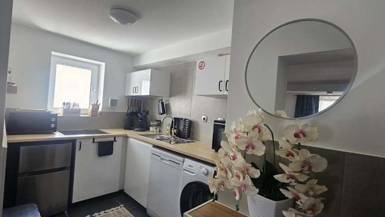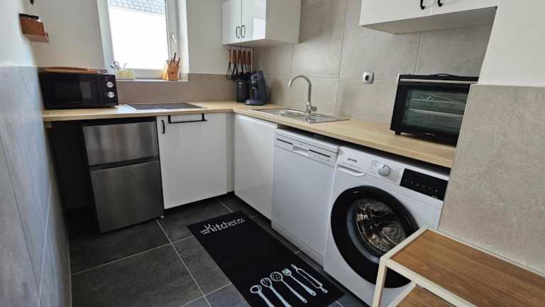 Die Ferienwohnung Meros bietet eine komfortable und gut ausgestattete Unterkunft mit zwei Schlafzimmern, einem Wohnzimmer sowie einer voll ausgestatteten Küche.