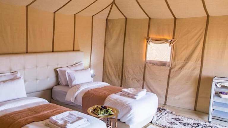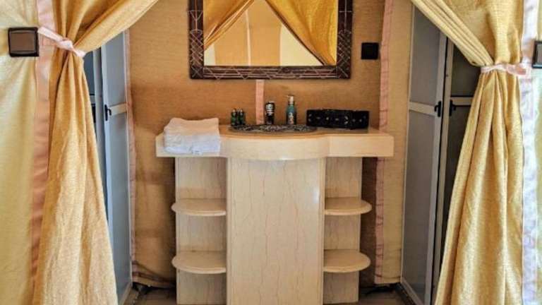 Die Wohneinheiten im Merzouga Sahara Luxury Camp verfügen über einen Sitzbereich mit einem Schlafsofa, einen Essbereich sowie eine voll ausgestattete Küche mit Kühlschrank, Geschirrspüler, Ofen und Mikrowelle. Einige Einheiten bieten ein eigenes Badezimmer mit Bidet, kostenlosen Pflegeprodukten, Hausschuhen und Bademänteln.