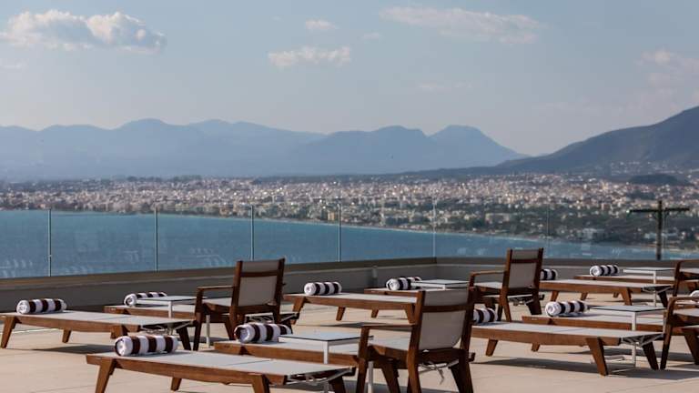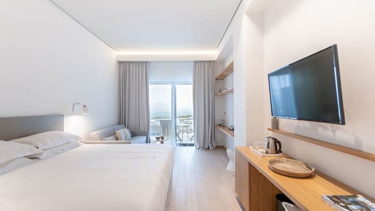 Die klimatisierten Zimmer sind mit einem Balkon mit Meerblick ausgestattet und verfügen über einen Schreibtisch, einen Wasserkocher, eine Minibar, einen Safe, einen Flachbild-TV, eine Terrasse sowie ein eigenes Badezimmer mit einer Dusche. Bettwäsche wird bereitgestellt.