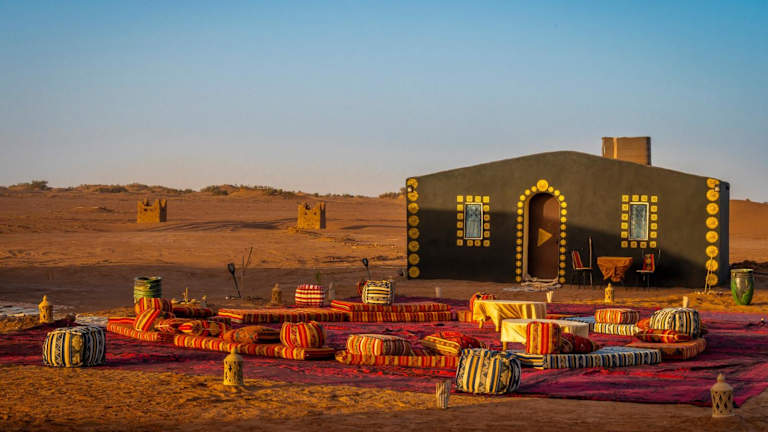 Das Taragalte Nomad Camp befindet sich in Mhamid, einer malerischen Region, die als Tor zur Sahara gilt. Die Umgebung zeichnet sich durch ihre beeindruckenden Sanddünen und die weite, unberührte Natur aus.