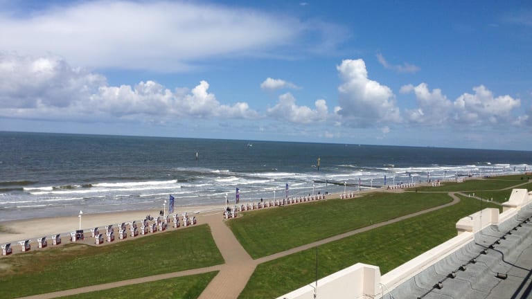 Das Kurhotel Germania liegt direkt am Weststrand von Norderney mit Blick auf die offene See und ca. 100 Meter vom Nordseestrand entfernt.