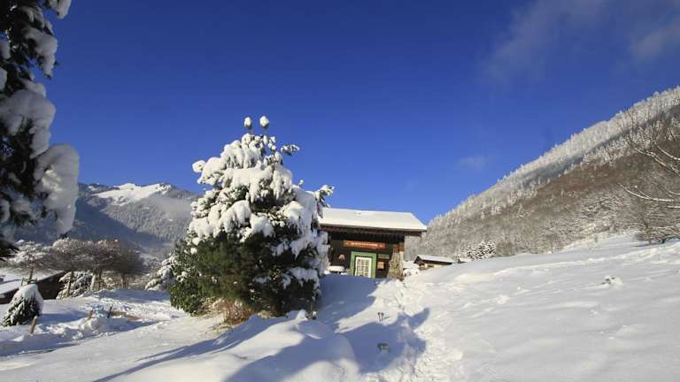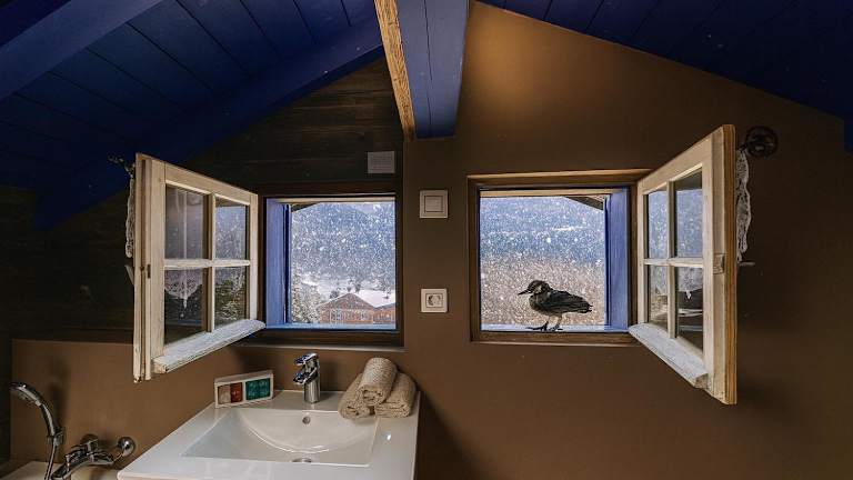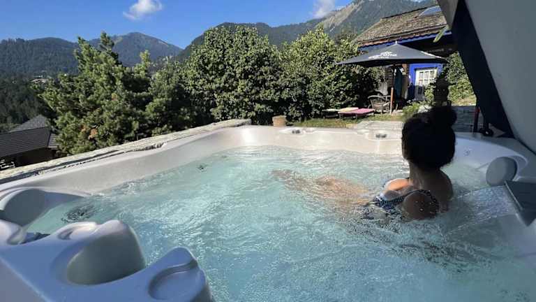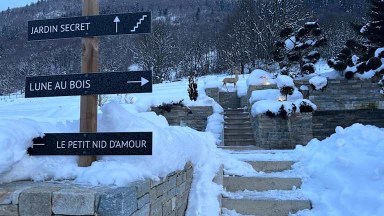 Die Micro-lodge, Le Petit Nid d'Amour bietet Übernachtungsmöglichkeiten in einem heimeligen Chalet mit einem Schlafzimmer und einem Badezimmer. Zur Ausstattung gehören Bettwäsche, Handtücher, ein Flachbild-TV und eine voll ausgestattete Küche. Gäste können die Terrasse nutzen, um die wunderschöne Berglandschaft zu geniessen. Die Unterkunft verfügt über einen Whirlpool und einen Garten.
