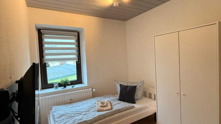 Die Mikro Apartment Grossenhain bietet einen angenehmen Blick auf den Garten und umfasst ein Schlafzimmer, ideal für Gäste, die Ruhe und Erholung suchen.