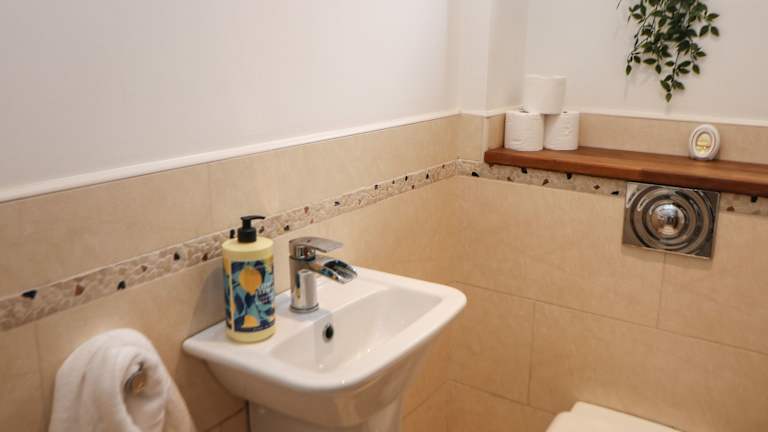 Das Ferienhaus ist ausgestattet mit einer Küche, die über einen Kühlschrank und einen Geschirrspüler verfügt. Ein TV und ein Sitzbereich sind ebenfalls vorhanden, sowie zwei Badezimmer mit Dusche.