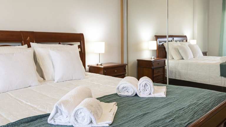 Die Ferienwohnung besteht aus zwei Schlafzimmern, einem Wohnzimmer und einer voll ausgestatteten Küche mit Kühlschrank und Kaffeemaschine. Es gibt zwei Badezimmer mit Dusche und Haartrockner. Handtücher und Bettwäsche werden bereitgestellt.