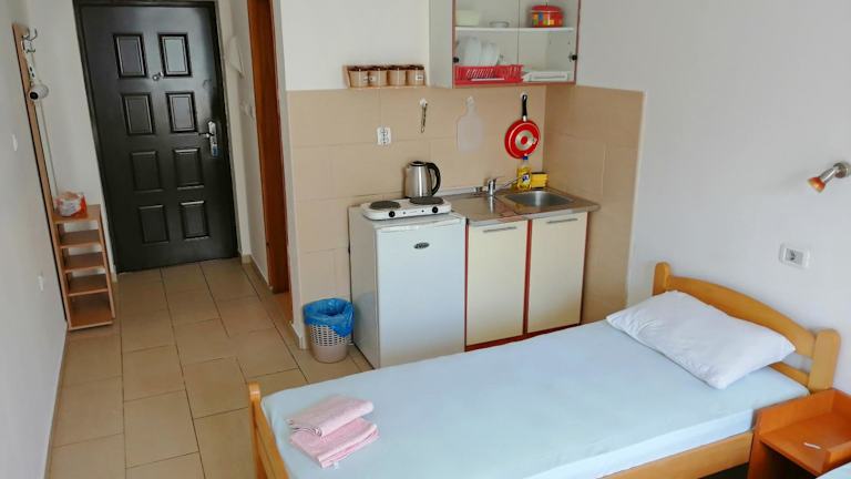 In den Apartments befindet sich eine voll ausgestattete Küche mit Kühlschrank, Herdplatte und Wasserkocher, ideal für die Selbstverpflegung.