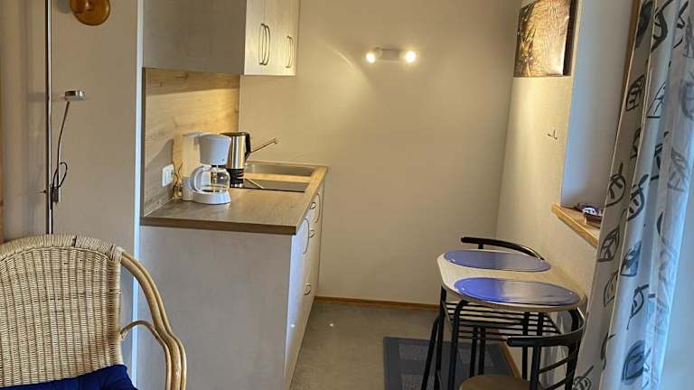 Die Ferienwohnung besteht aus 1 Schlafzimmer und einem Wohnzimmer sowie einer voll ausgestatteten Küchenzeile, die mit einem Kühlschrank und einer Kaffeemaschine ausgestattet ist. Das Badezimmer verfügt über eine Dusche und es werden kostenlose Pflegeprodukte bereitgestellt. Handtücher und Bettwäsche sind ebenfalls vorhanden.