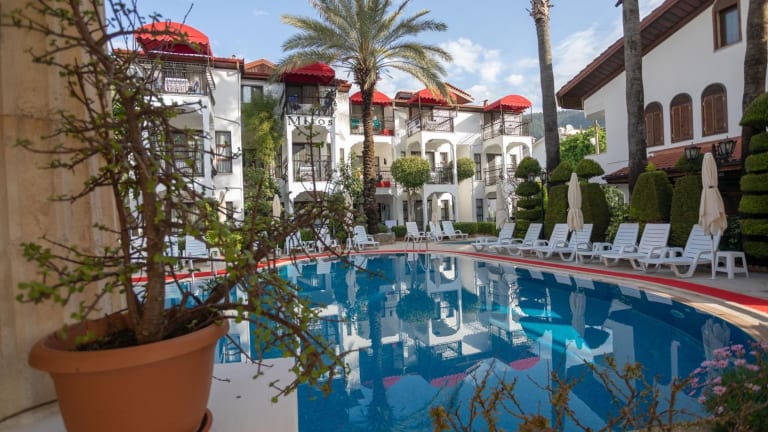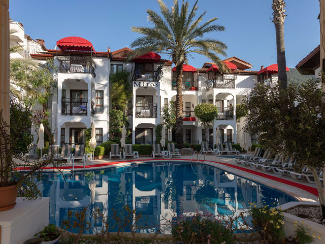 Die Mitos Apartments in Icmeler bieten eine ideale Lage im Herzen der Stadt. Die Unterkünfte sind modern und gut ausgestattet und verfügen über eine voll ausgestattete Küchenzeile. Das Aparthotel bietet ein abwechslungsreiches Frühstück und ein Restaurant, das verschiedene kulinarische Optionen bietet. Der Außenpool und die Sonnenterrasse laden zum Entspannen ein, während die Umgebung Möglichkeiten zum Radfahren bietet. Mit einer kurzen Fahrt erreichen Sie auch beliebte Ausflugsziele wie Marmaris und Rhodos-Stadt.