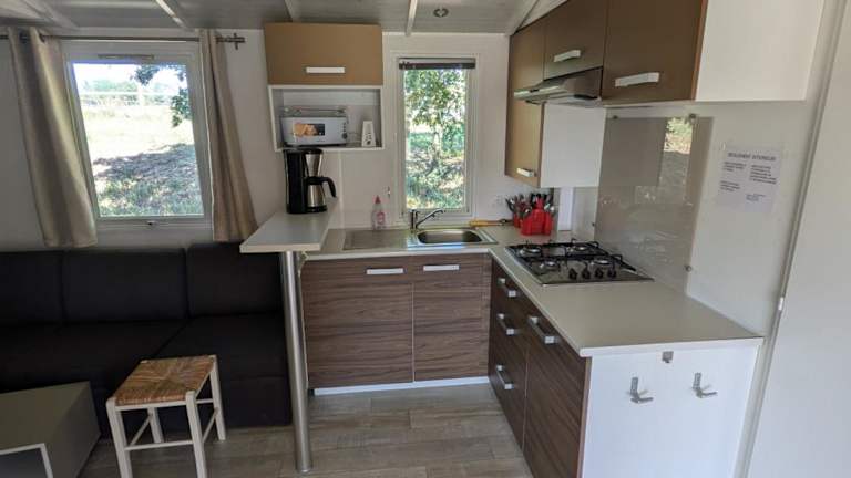 Die Mobilheime sind mit einer Küche ausgestattet, die unter anderem über einen Kühlschrank, eine Mikrowelle, eine Herdplatte, einen Toaster und eine Kaffeemaschine verfügt. Die Selbstverpflegung ermöglicht es Gästen, nach ihren eigenen Wünschen zu kochen.