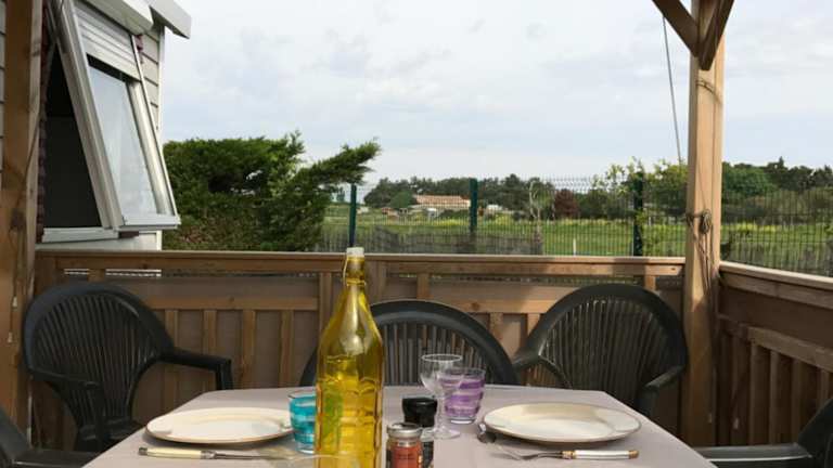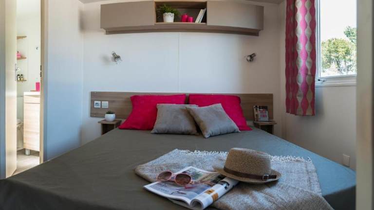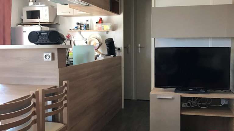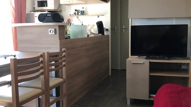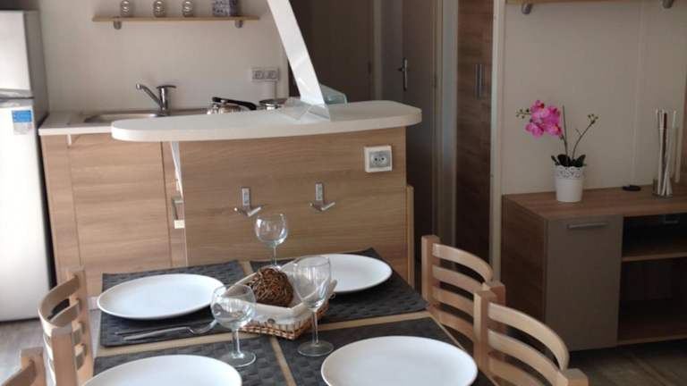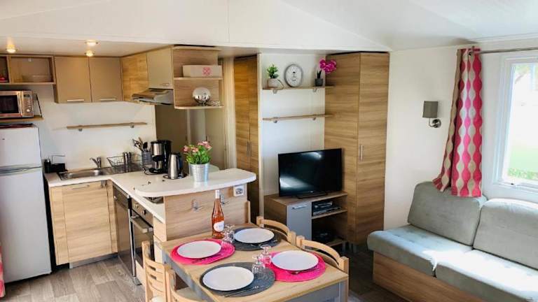 Die Mobilheime sind gut ausgestattet mit Küchen, die einen Kühlschrank, einen Ofen, eine Mikrowelle, eine Kaffeemaschine und einen Wasserkocher umfassen. Des Weiteren bieten die Mobilheime ein Wohnzimmer mit einem Schlafsofa und einem Flachbild-TV sowie ein eigenes Badezimmer, ausgestattet mit Haartrockner und Dusche. Die gemütliche Atmosphäre wird durch einen Blick auf den Garten abgerundet.