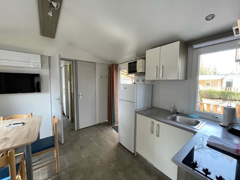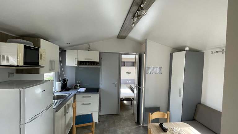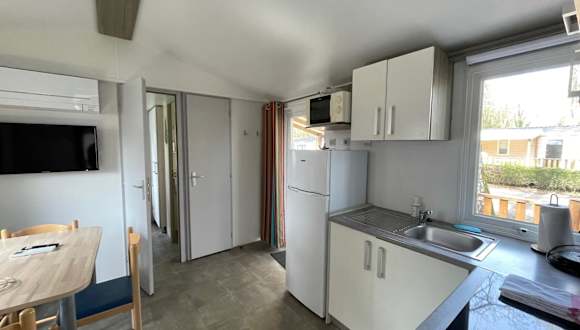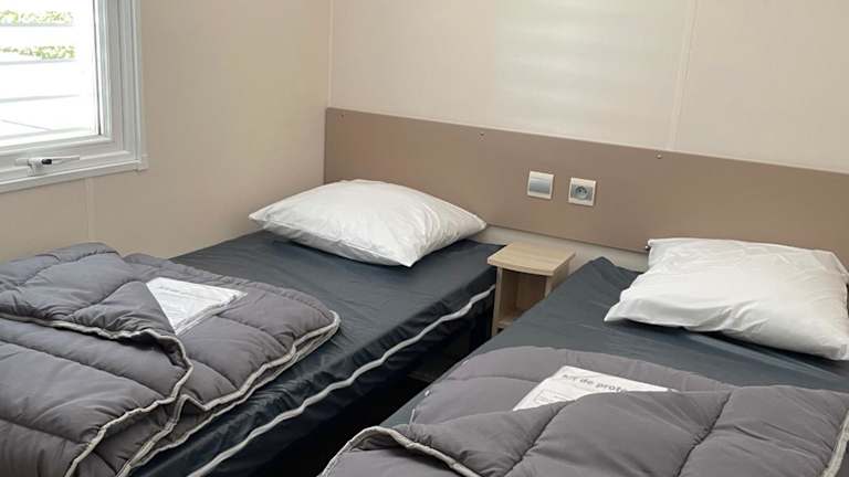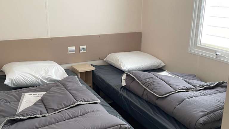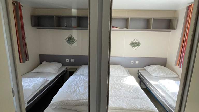 Das Mobilhome bietet Platz für bis zu 6 Personen und besteht aus 3 Schlafzimmern, einer gut ausgestatteten Küche sowie einem Badezimmer. Für zusätzlichen Komfort können auf Anfrage Handtücher und Bettwäsche bereitgestellt werden.
