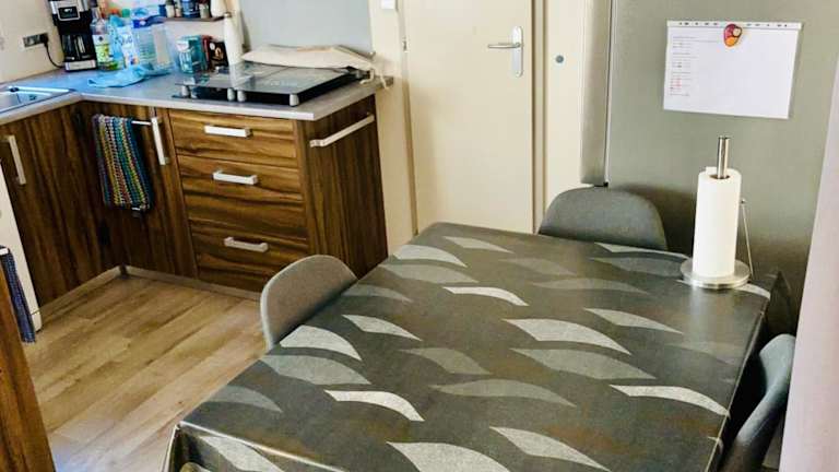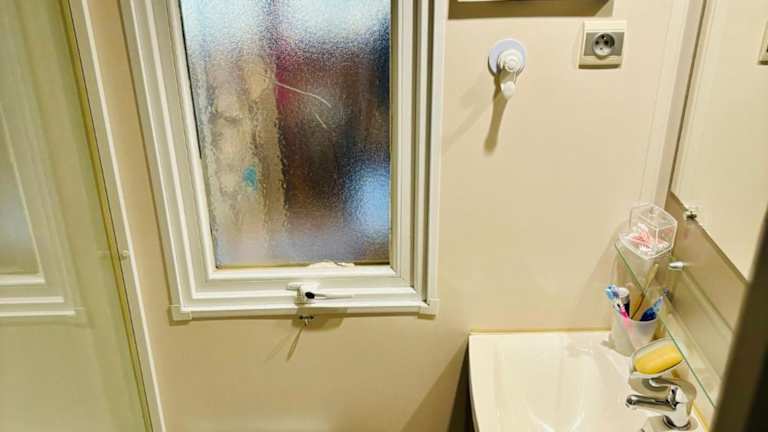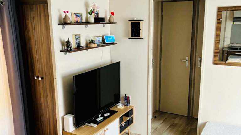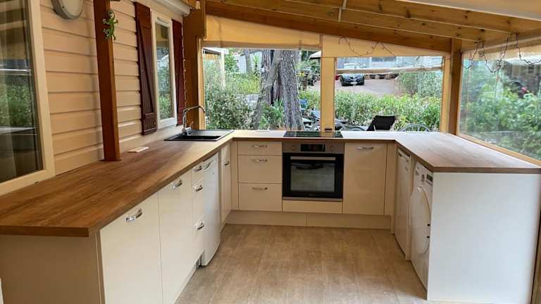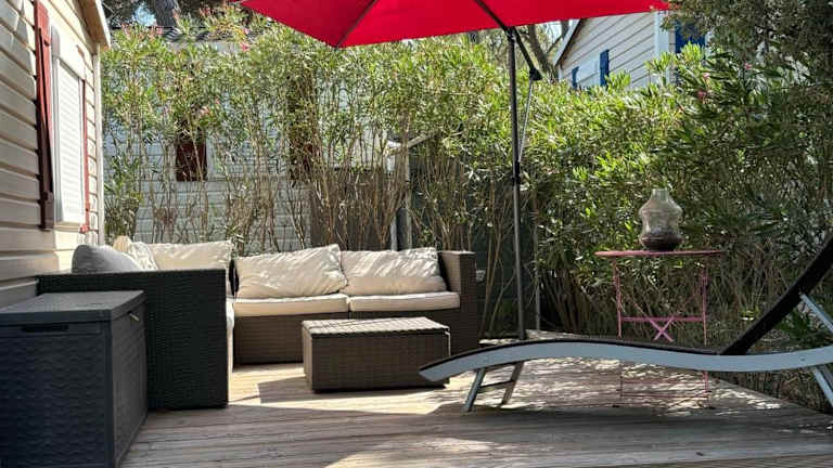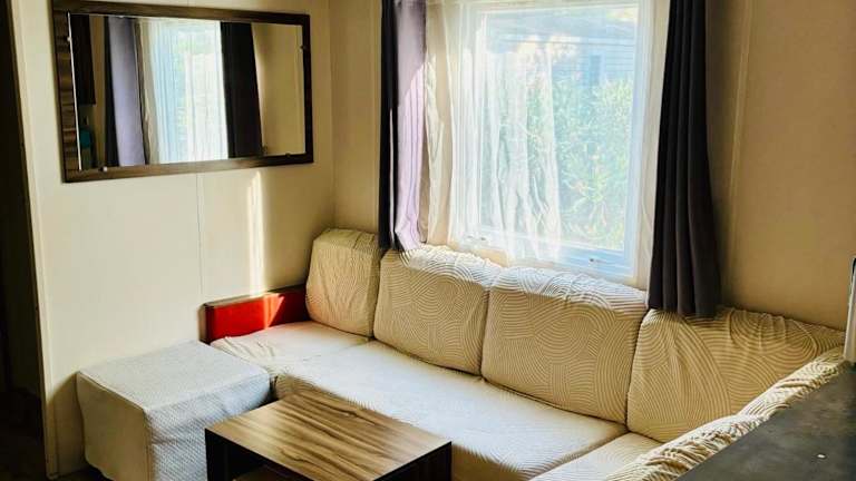 Das Mobil home bietet einen heimeligen Sitzbereich sowie verschiedene Annehmlichkeiten. Jede Wohneinheit verfügt über ein eigenes Badezimmer mit einer Dusche und ist zudem klimatisiert.
