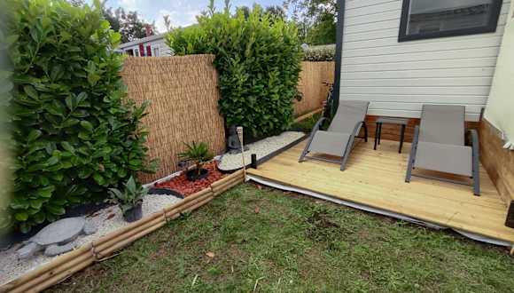 Mobile home à Mimizan géré par un particulier bietet einen kostenlosen Privatparkplatz sowie einen direkten Zugang zu einem Kasino. Die Unterkunft verfügt über eine Terrasse mit Gartenblick und einen Sitzbereich, wo Gäste entspannen können.