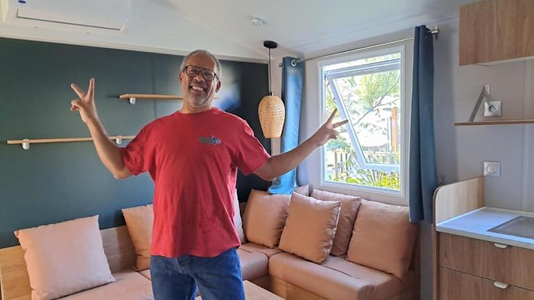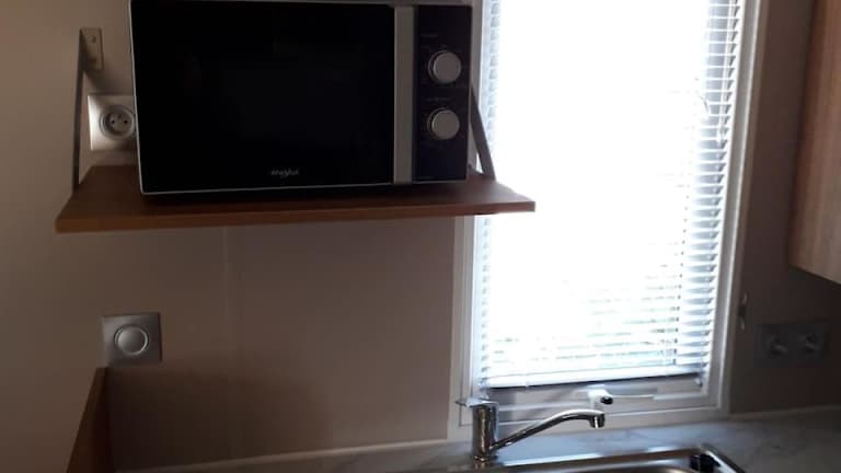 Die Unterkunft umfasst ein klimatisiertes Mobile Home mit zwei Schlafzimmern, einem Wohnzimmer und einer voll ausgestatteten Küche, die mit einem Kühlschrank und einer Kaffeemaschine ausgestattet ist. Es gibt ein Badezimmer mit Dusche und auf Wunsch können Handtücher und Bettwäsche gegen Gebühr bereitgestellt werden.