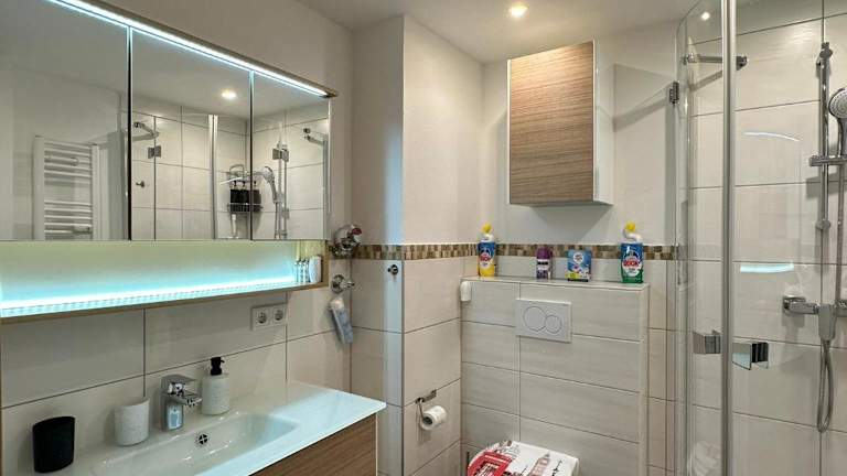 Die Ferienwohnung verfügt über ein Schlafzimmer, eine Küche mit Kühlschrank und Geschirrspüler, einen Flachbild-TV, einen Sitzbereich sowie ein Badezimmer mit Dusche. Handtücher und Bettwäsche sind ebenfalls vorhanden.