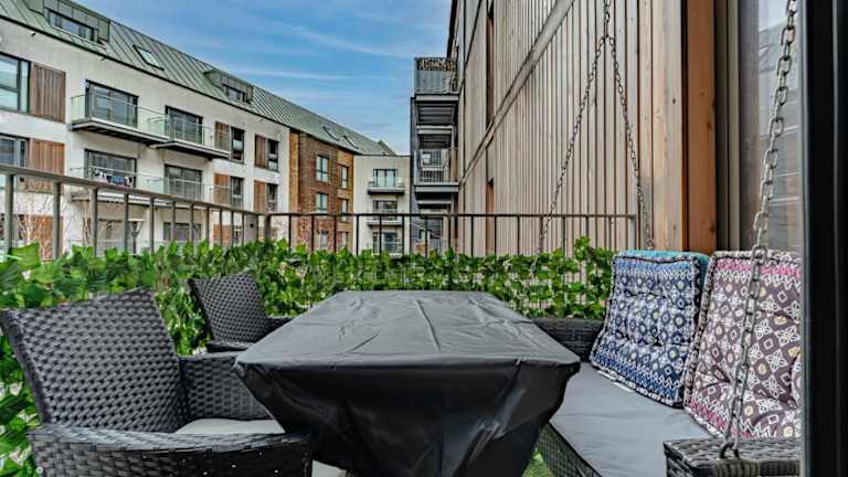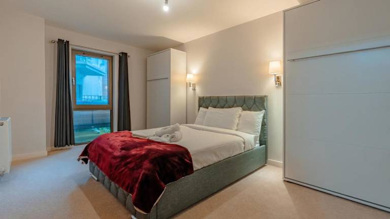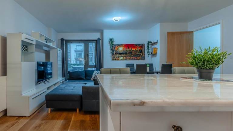 Die Ferienwohnung verfügt über ein Schlafzimmer, ein Wohnzimmer, einen Flachbild-TV sowie eine gut ausgestattete Küche mit Kühlschrank und Geschirrspüler. Ein Badezimmer mit Dusche ist ebenfalls vorhanden. Handtücher und Bettwäsche werden bereitgestellt, und die Wohnung bietet einen Balkon mit Stadtblick.