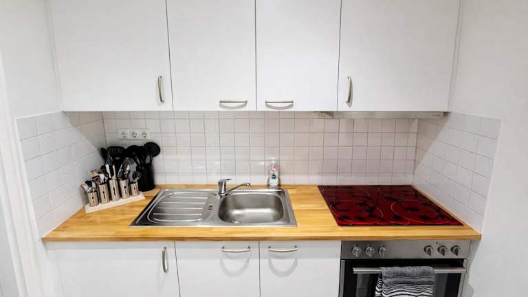Die Ferienwohnung umfasst 2 Zimmer, darunter ein Schlafzimmer und ein Wohnzimmer mit einem Flachbild-TV mit Satellitenkanälen. Die voll ausgestattete Küche ist mit einem Kühlschrank und einem Ofen ausgestattet. Des Weiteren gibt es ein Badezimmer mit einer Dusche. Handtücher und Bettwäsche werden zur Verfügung gestellt.