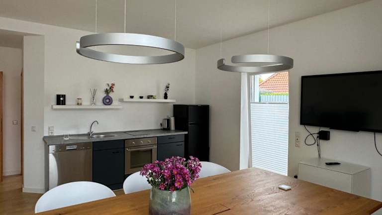 Die Ferienwohnung umfasst ein Schlafzimmer, eine gut ausgestattete Küche mit Kühlschrank und Geschirrspüler, sowie einen gemütlichen Sitzbereich. Ein Flachbild-TV und ein Badezimmer mit Dusche sind ebenfalls vorhanden. Handtücher und Bettwäsche werden bereitgestellt. Die Unterkunft ist familienfreundlich, Haustiere sind gestattet.