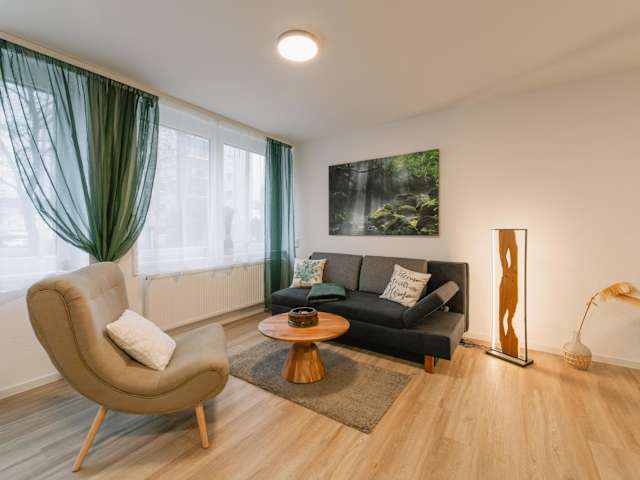 Die Ferienwohnung besteht aus einem Schlafzimmer, einem Wohnzimmer sowie einer voll ausgestatteten Küche mit Kühlschrank und Kaffeemaschine. Des Weiteren verfügt die Unterkunft über ein Badezimmer mit Dusche und Haartrockner. Handtücher und Bettwäsche werden zur Verfügung gestellt.