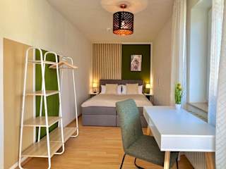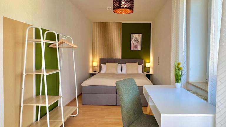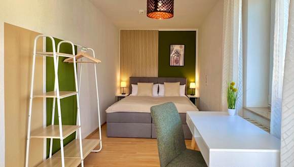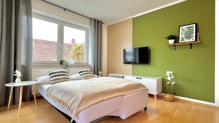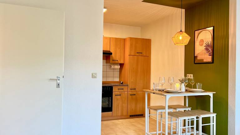 Die Ferienwohnung besteht aus einem Schlafzimmer, einem Wohnzimmer und einer voll ausgestatteten Küche, welche mit einem Kühlschrank und einer Kaffeemaschine eingerichtet ist. Das Badezimmer bietet eine Badewanne sowie kostenlose Pflegeprodukte. Handtücher und Bettwäsche werden bereitgestellt. Es sind schallisolierte Zimmer vorhanden.