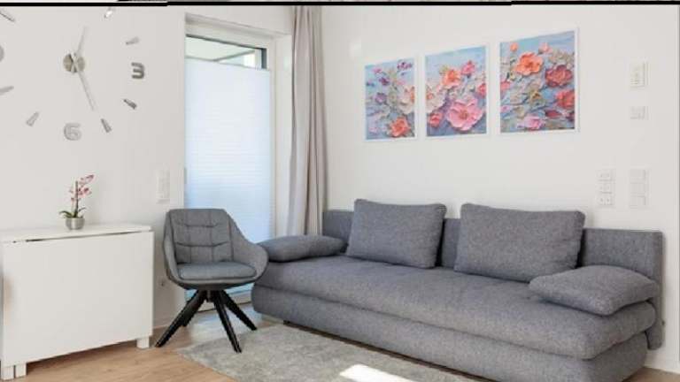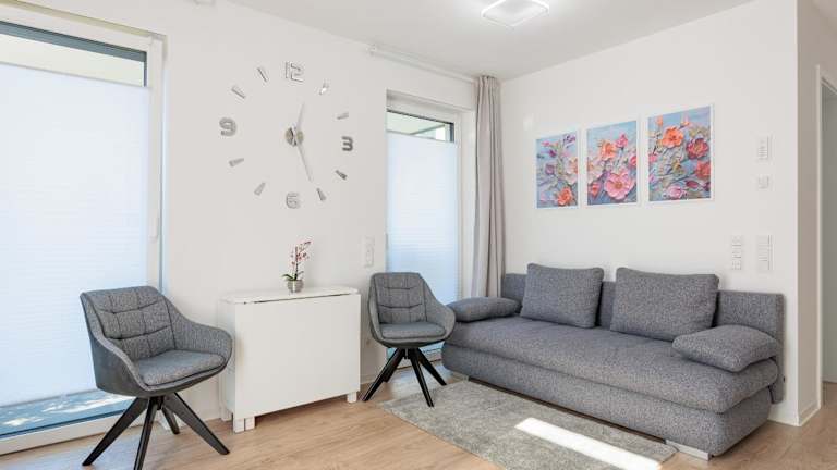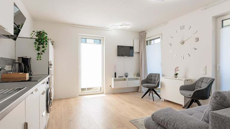 Die Ferienwohnung bietet ein Schlafzimmer, ein Wohnzimmer und ein modernes Badezimmer mit einer Dusche. Zur Ausstattung gehören ein Flachbild-TV sowie eine gut ausgestattete Küche mit Kühlschrank und Geschirrspüler. Handtücher und Bettwäsche sind ebenfalls verfügbar.