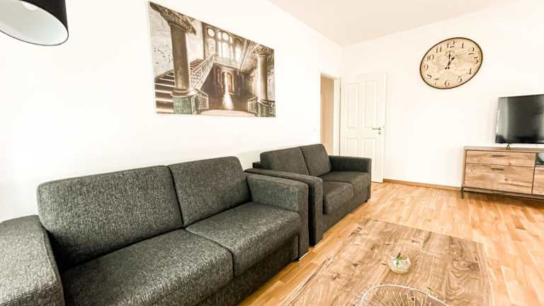 Die Ferienwohnung besteht aus einem Schlafzimmer, einem Wohnzimmer und einer voll ausgestatteten Küche mit einem Kühlschrank sowie einer Kaffeemaschine. Zudem gibt es ein Badezimmer mit Dusche und Haartrockner. Handtücher und Bettwäsche werden zur Verfügung gestellt.