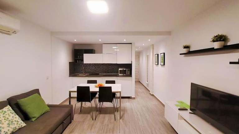 Die Ferienwohnung besteht aus einem Schlafzimmer, einem Wohnzimmer und einer voll ausgestatteten Küche mit Kühlschrank und Kaffeemaschine. Zur Ausstattung gehört ein Badezimmer mit Dusche und Haartrockner. Handtücher und Bettwäsche werden bereitgestellt. Die Klimaanlage sorgt für ein angenehmes Raumklima.