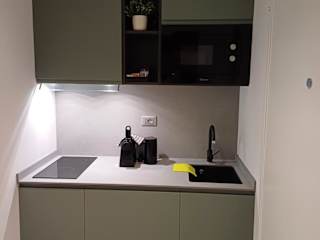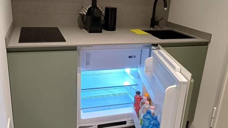 Die Ferienwohnung verfügt über eine Küchenzeile, die mit einem Kühlschrank, einer Mikrowelle, einer Kaffeemaschine und einem Wasserkocher ausgestattet ist. Es stehen somit Möglichkeiten zur Selbstverpflegung zur Verfügung.