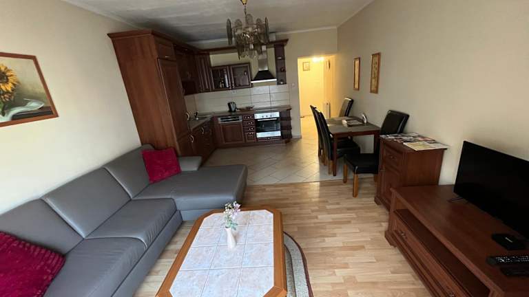 Die Ferienwohnung verfügt über 2 Schlafzimmer, ein Wohnzimmer sowie einen Balkon mit Blick auf die Stadt. Zur Ausstattung zählen ein Flachbild-TV, eine gut ausgestattete Küche mit Kühlschrank und Geschirrspüler sowie ein Badezimmer mit Badewanne. Handtücher und Bettwäsche stehen den Gästen zur Verfügung.