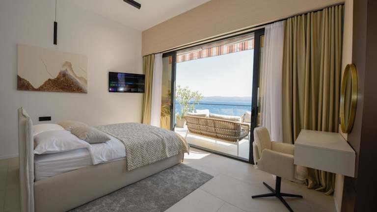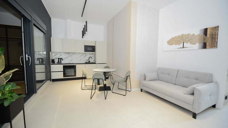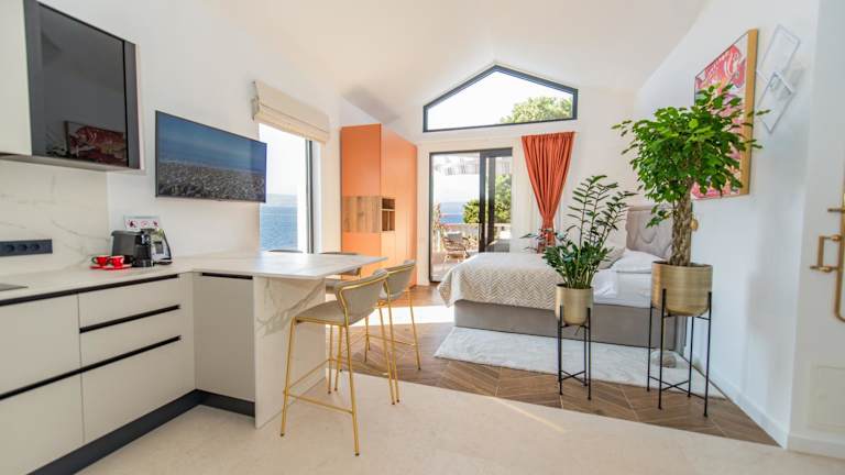 Die Apartments verfügen über eine moderne, offene Wohn- und Essbereich, ausgestattet mit einer Küchenzeile, die ein Kochfeld, einen Wasserkocher und einen Kühlschrank umfasst. Jedes Apartment bietet zusätzlich einen Balkon mit Meerblick, ideal zum Entspannen.