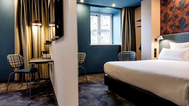 Die Zimmer im Motel One Edinburgh-Princes sind modern und stilvoll eingerichtet und bieten den Gästen einen angenehmen Aufenthalt. Die türkis- und beigefarbenen Oberflächen verleihen den Zimmern eine frische und einladende Atmosphäre. Zur Ausstattung gehören kostenfreies WLAN, ein Flachbild-TV und ein modernes Badezimmer.