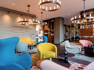 Das Herzstück des Hotels ist die großzügige „One Lounge“, die Lobby, Frühstücksraum und Bar in einem ist. Hier können die Gäste frühstücken, einen Snack genießen und rund um die Uhr den kostenfreien W-LAN Zugang des Hotels nutzen. Eine Bilderreihe des Essener Fotografen Horst Lang versetzt die Gäste zurück in die Zeit des deutschen Wirtschaftswunders. Die aus dessen Bildband stammenden Schwarzweißaufnahmen dokumentieren in einzigartiger Weise die Industrielandschaft ab Mitte der 50er Jahre. Ergänzt wird das nos-talgische Szenario durch originale Industrieleuchten sowie den Schriftzug „Glück auf“ hinter der Rezeption.