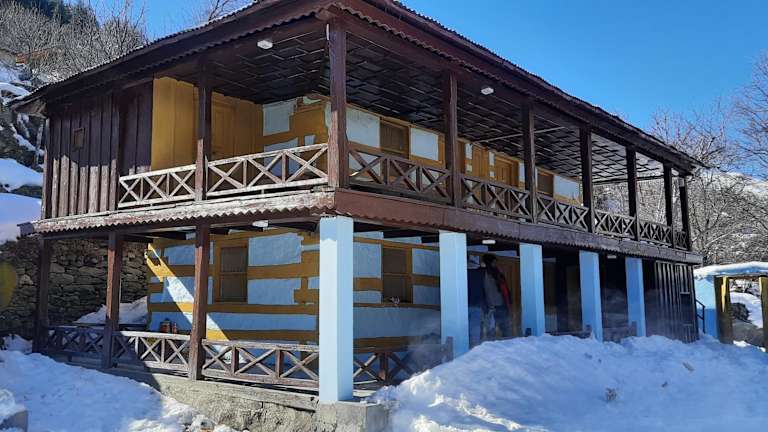 Das Hotel Mountain Village Stay - Dharali Heights Harsil befindet sich in Harsil, Uttarakhand, Indien, direkt an der Gangotri Strasse. Die Lage bietet eine beeindruckende Sicht auf die umliegenden Berge und den Fluss.