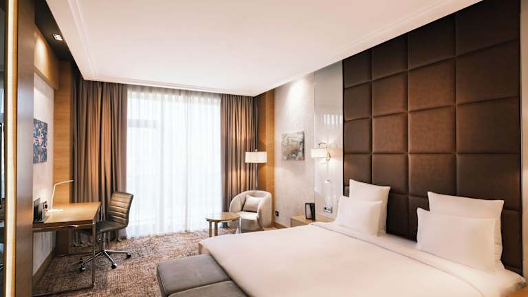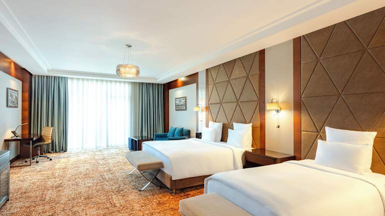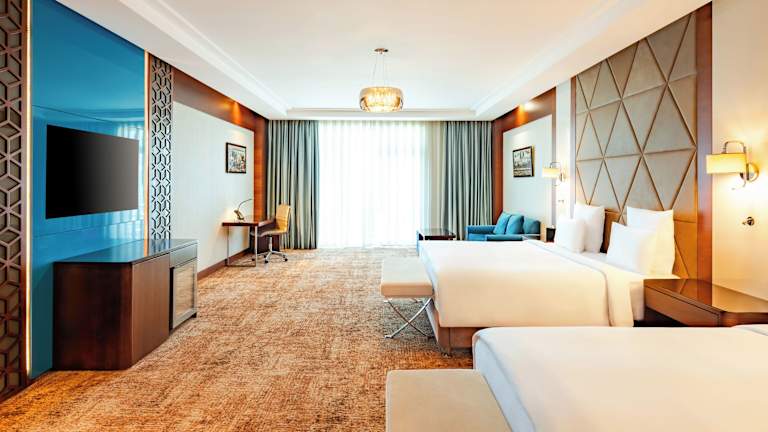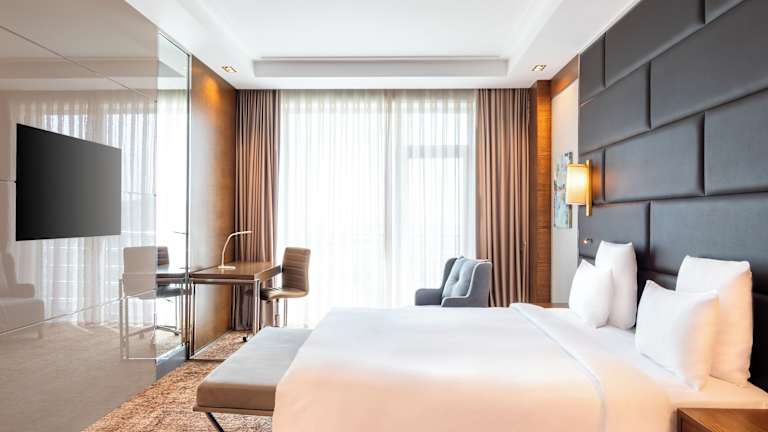 Die Zimmer sind mit Klimaanlage und Heizung ausgestattet und bieten Bequemlichkeiten wie ein Kingsizebett, ein Sofabett, eine Minibar, einen Zimmersafe sowie einen Schreibtisch. Eine Tee-/Kaffeemaschine steht ebenfalls zur Verfügung. Die Badezimmer sind mit einer Dusche, Haartrockner und Bademänteln ausgestattet. Kosmetikartikel und eine Auswahl an Handtüchern sind ebenfalls vorhanden. Zustellbetten können angefordert werden, und rollstuhlgerechte Zimmer sind buchbar.