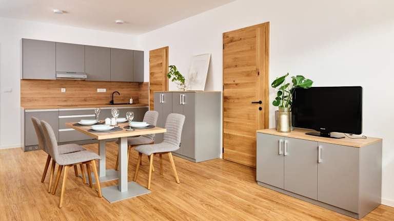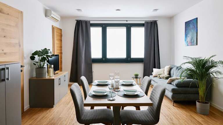 Die Wohneinheiten sind ausgestattet mit einem Schlafsofa, einem Sitzbereich und einem Flachbild-TV mit Satellitenkanälen. Zudem gibt es eine gut ausgestattete Küche mit einem Essbereich, einem Kühlschrank, einem Geschirrspüler, einer Herdplatte sowie einem Wasserkocher. Jedes Zimmer verfügt über einen Safe und ein eigenes Badezimmer mit einem Haartrockner.
