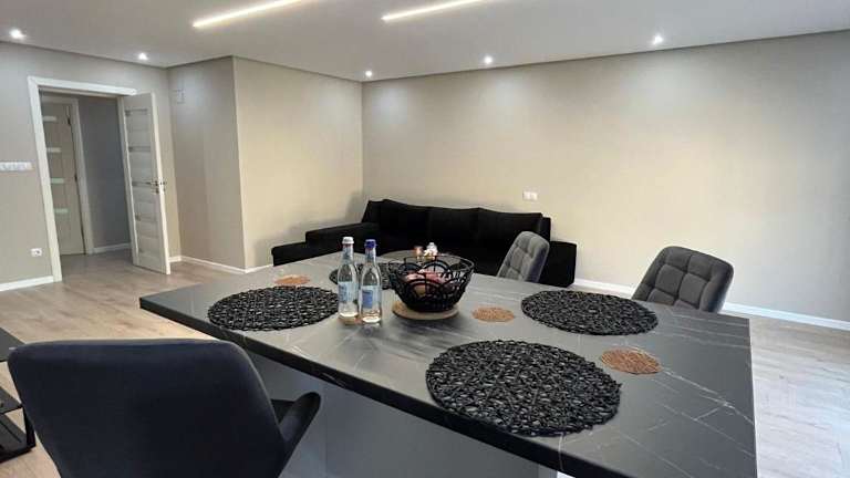 Die Ferienwohnung umfasst zwei Schlafzimmer, ein Wohnzimmer sowie eine voll ausgestattete Küche mit Kühlschrank und Kaffeemaschine. Zudem bietet die Unterkunft drei Badezimmer mit Dusche und Haartrockner. Handtücher und Bettwäsche werden bereitgestellt.