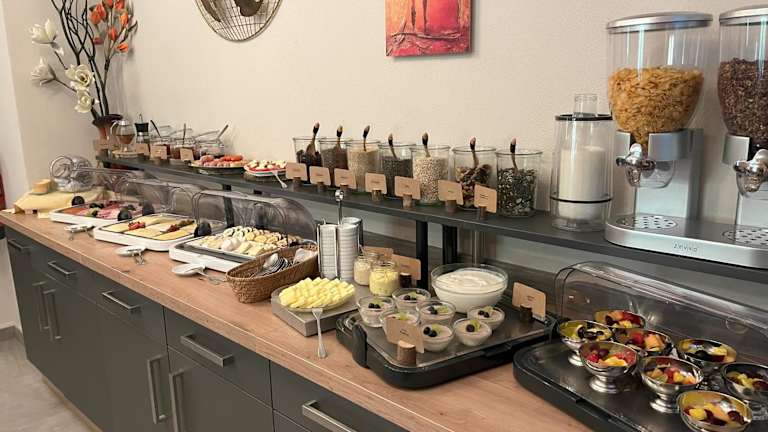Gäste können ein als Buffet angebotenes Frühstück geniessen.