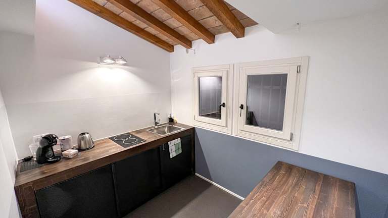 Die Unterkunft bietet eine voll ausgestattete Küche mit einem Essbereich. Dazu gehören ein Kühlschrank, eine Herdplatte, ein Toaster sowie eine Kaffeemaschine und ein Wasserkocher.