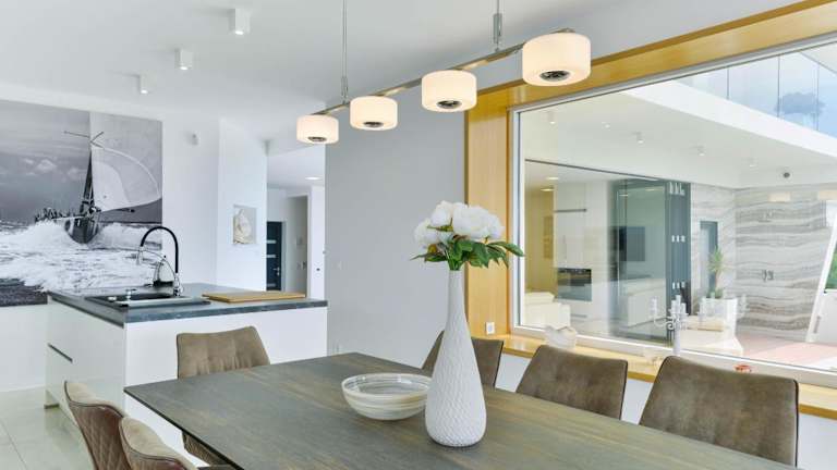 Die Wohnung ist mit einer voll ausgestatteten Küche inklusive Kühlschrank und Geschirrspüler ausgestattet, die ideal für Selbstverpflegung ist. Ein Essbereich ist ebenfalls vorhanden.