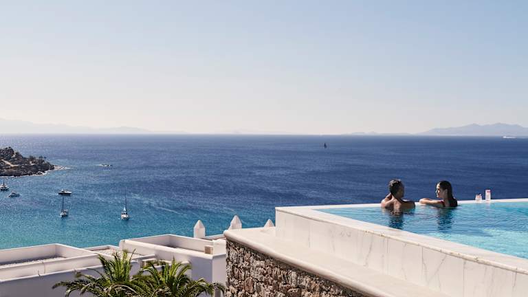 Die Zimmer im Myconian Ambassador Relais & Chateaux sind stilvoll eingerichtet und bieten einen herrlichen Blick auf das Meer. Jedes Zimmer ist individuell gestaltet und verfügt über Annehmlichkeiten wie eine Klimaanlage, einen Safe, einen Schreibtisch, eine Nespressomaschine und einen Flachbildfernseher. Einige Zimmer bieten auch einen Whirlpool im Freien, einen eigenen Pool oder einen Gemeinschaftspool. Die Badezimmer sind modern und verfügen über eine Dusche mit Regendusche, einen Bademantel, Hausschuhe und einen Haartrockner.