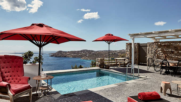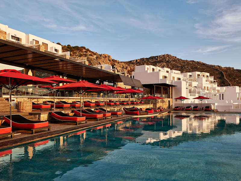 Das Myconian Avaton Resort ist ein luxuriöses Hotel, das 200 Meter über dem Ägäischen Meer thront. Das Resort fügt sich nahtlos in die umgebende Natur ein und bietet eine harmonische Atmosphäre gepaart mit Privatsphäre und modernem Komfort. Das Hotel gehört zur Design Hotels Kollektion und bietet eine Vielzahl von Annehmlichkeiten, darunter zwei Außenpools, ein Thalassotherapie-Wellnesscenter sowie ein reichhaltiges Angebot an gastronomischen Optionen.