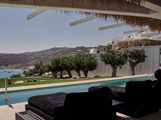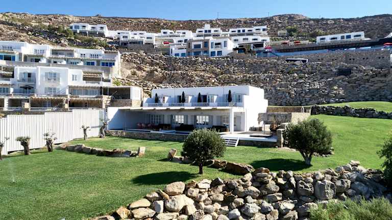 Die Villen liegen direkt am ruhigen Strand von Elia und bieten eine ausgezeichnete Anbindung zum lebhaften Nachtleben von Mykonos Stadt, welches nur 12 km entfernt ist. Der Flughafen Mykonos Island National Airport ist ebenfalls etwa 12 km entfernt. Die Entfernung zum Strand Elia beträgt ca. 200 m und ist in kurzer Zeit erreichbar. Die Umgebung ermöglicht einen entspannten Aufenthalt mit Restaurants und Geschäften in der Nähe.