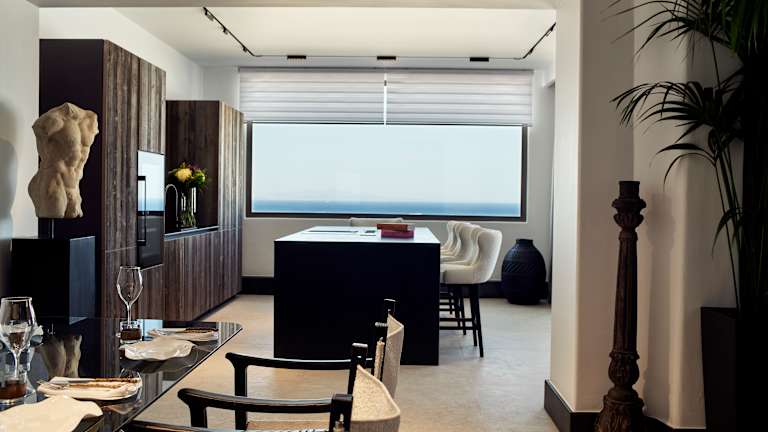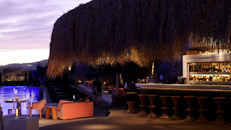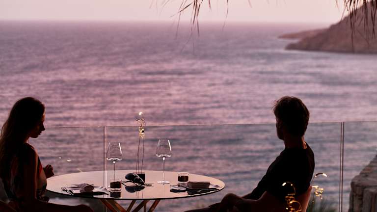 Die Verpflegung im Myconian Villa Collection umfasst ein amerikanisches Frühstücksbuffet, das täglich serviert wird. Das à la carte-Restaurant Cabbanes bietet mediterrane Küche mit Blick auf das Meer. Zusätzlich gibt es eine Poolbar, die leichte Snacks und Cocktails anbietet. Abendessen wird in Form eines 4-Gänge-Menüs im Hauptrestaurant serviert.