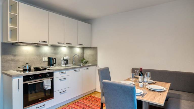 Die Ferienwohnung ist ausgestattet mit 2 Schlafzimmern, 1 Badezimmer, Bettwäsche und Handtüchern. Zur Ausstattung gehören zudem ein Flachbild-TV, ein Essbereich, eine voll ausgestattete Küche und ein Balkon mit Stadtblick.